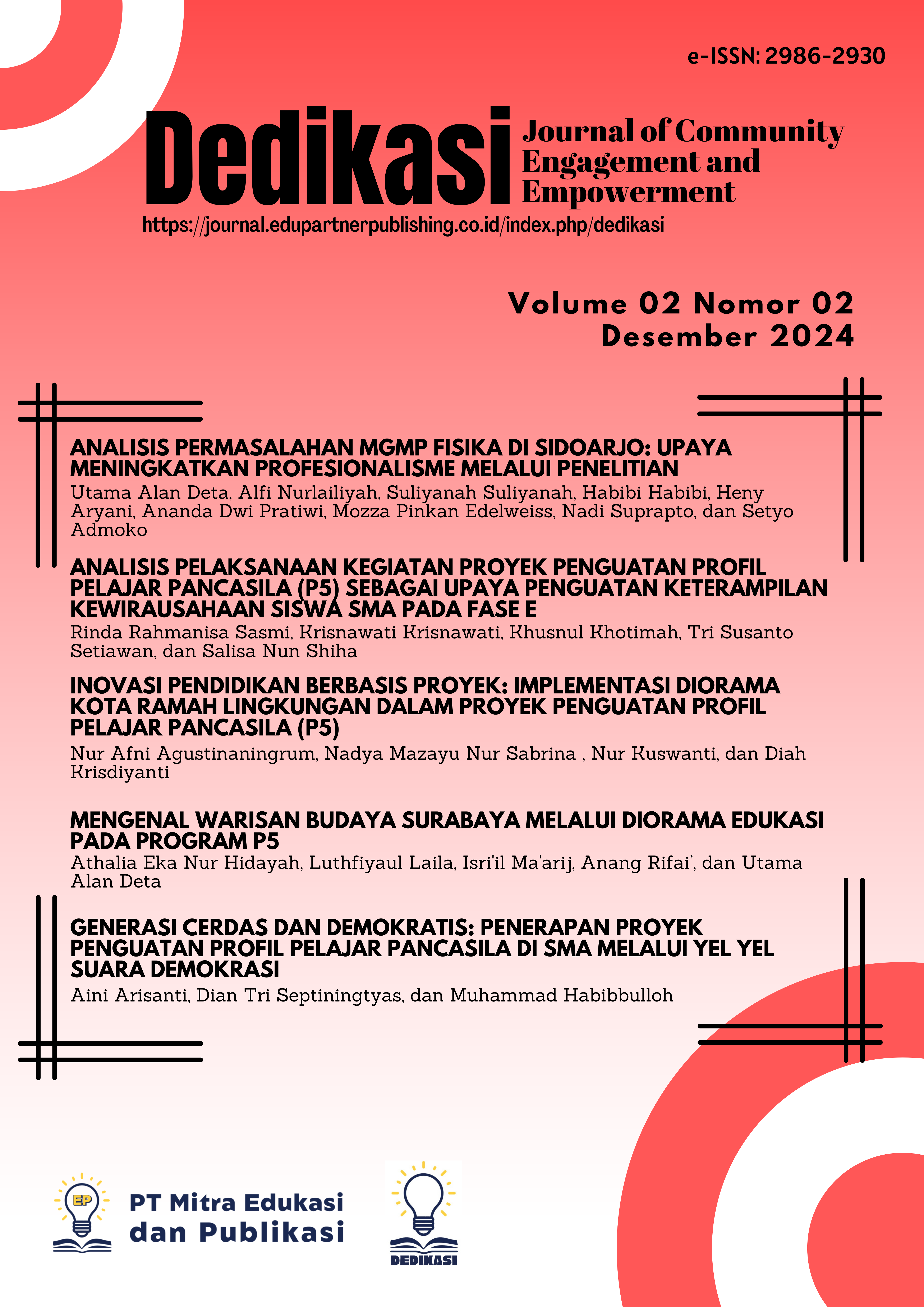 Kota Surabaya yang menjadi salah satu kota yang penuh sejarah dan kaya akan kearifan lokal memerlukan upaya serius untuk melindungi dan menghidupkan kembali kekayaan lokal, nilai-nilai ini lambat laun akan memudar dan kehilangan relevansinya di tengah masyarakat. Melalui Proyek Penguatan Profil Pelajar Pancasila (P5) yang bertujuan untuk mengajarkan sejarah dan melestarikan kearifan lokal dengan mengintegrasikan dengan seni, salah satunya melalui pembuatan diorama dengan teman kearifan lokal Kota Surabaya. Kegiatan P5 dilaksanakan di salah satu sekolah menengah atas Kota Surabaya dengan subyek peserta didik kelas XI. Proyek ini dilaksanakan kurang lebih selama enam minggu. Salah satu hasil diorama peserta didik yang tidak hanya menarik secara visual tetapi juga mampu mengomunikasikan nilai-nilai sejarah dan pemanfaatan barang bekas kepada penikmat seni diorama adalah diorama mengenai Monumen Bambu Runcing. Penerapan metode ini memiliki dampak positif terhadap pemahaman peserta didik tentang kearifan lokal. Hasil dari proyek ini dapat disimpulkan bahwa peserta didik tidak hanya dapat menghasilkan karya seni yang menarik tetapi juga dapat belajar menghargai nilai-nilai budaya lokal. Hal ini menjadi bukti bahwa pendekatan pembelajaran berbasis proyek merupakan metode yang efektif untuk mengintegrasikan pendidikan budaya ke dalam kurikulum sekolah. Selain memberikan pengalaman belajar yang bermakna, kegiatan ini juga mengembangkan keterampilan kreatif, kolaboratif, dan kritis peserta didik, yang menjadi fondasi penting dalam menghadapi tantangan era Society 5.0.