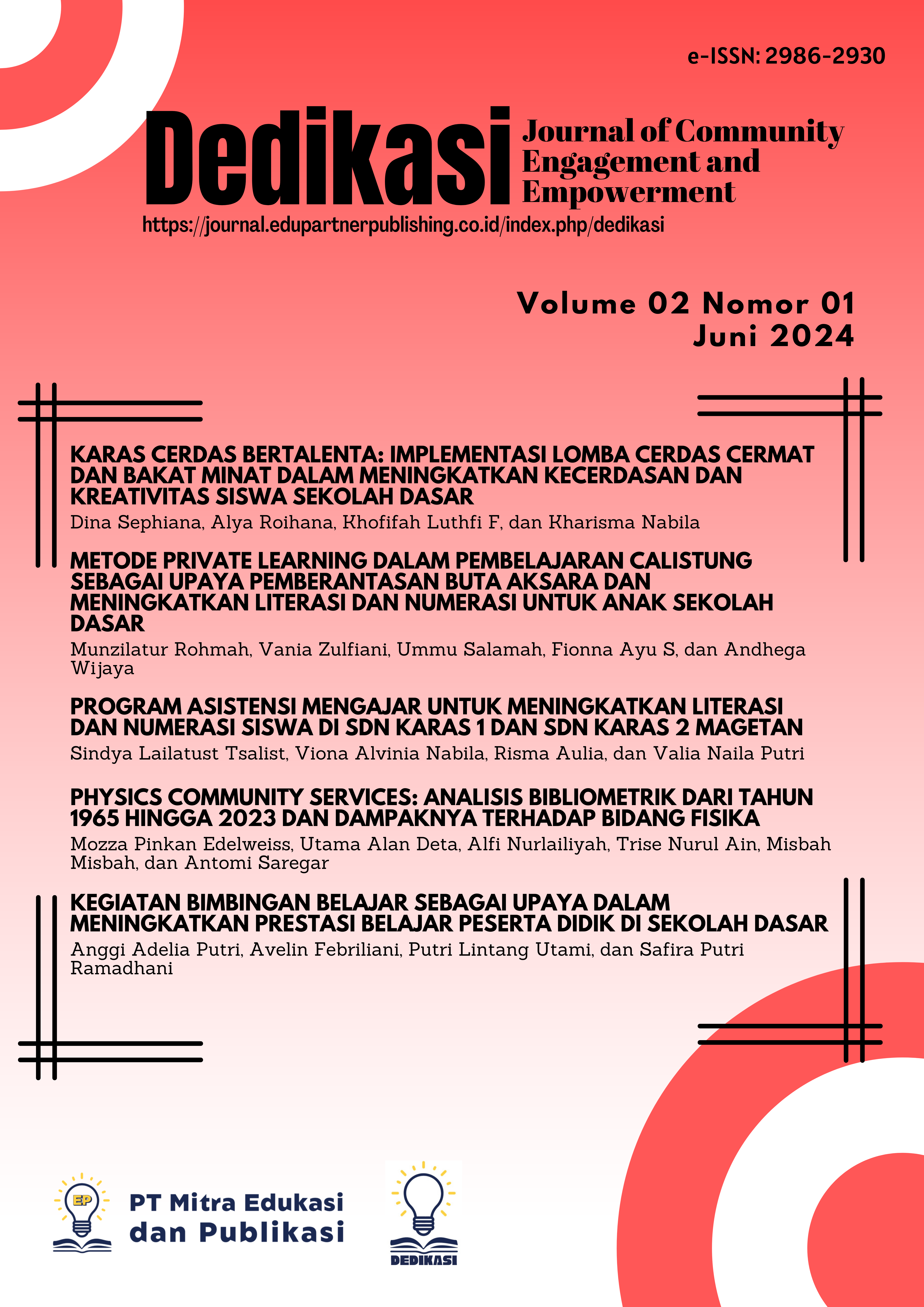 Astuti, G. P., & Susilowati, T. (2022). Pelaksanaan literasi dan numerasi melalui asistensi mengajar di SD Negeri Trombol 1 Kecamatan Mondokan Kabupaten Sragen. Jurnal Abdi Masyarakat Indonesia, 2(3), 977–984. DOI: https://doi.org/10.54082/jamsi.354.